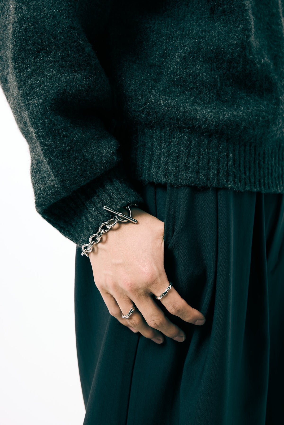 無骨でいて繊細。トグルタイプのチェーンブレスレット。ほどよい厚みと丸みを持たせたチェーンが、手元にしっかりとした存在感を与えてくれます。シンプルな構造美とモダンな抜け感が共存し、どんなスタイルにも自然に馴染むデザイン。トグルタイプの留め具で着脱もスマートに。<素材>サージカルステンレス<カラー>SILVER<サイズ>18cm、20cm<付属品>jewelry Boxショップカード