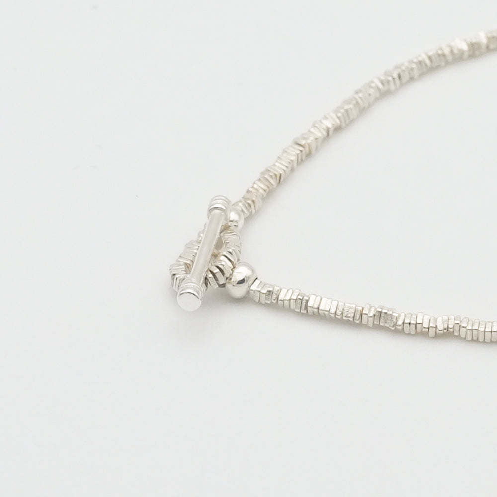 フラットなビーズが、幾何学模様を描きながら繊細に連なるブレスレット。SILVER925により、半永久的な輝きを演出してくれます。