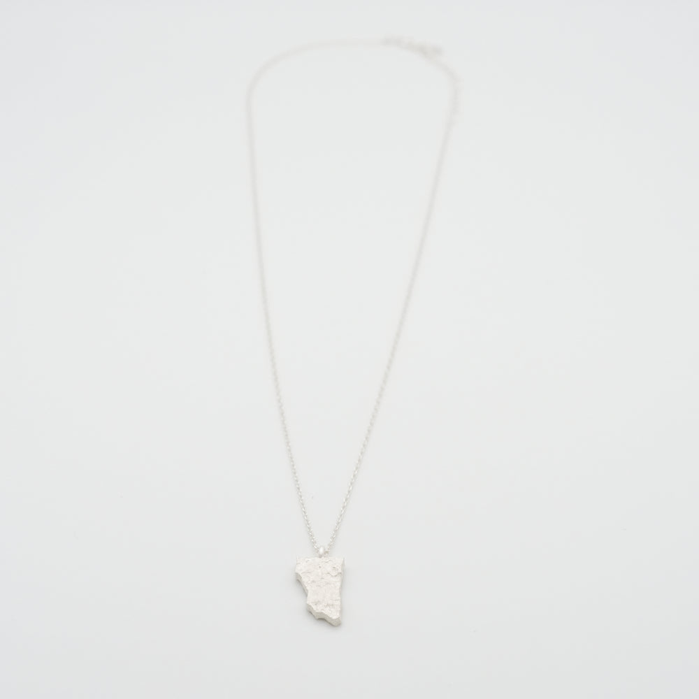 ユニークな形状で、自然な風合いを感じさせるペンダントが首元にさりげないアクセントを加え、シンプルながらも個性を引き立てます。
